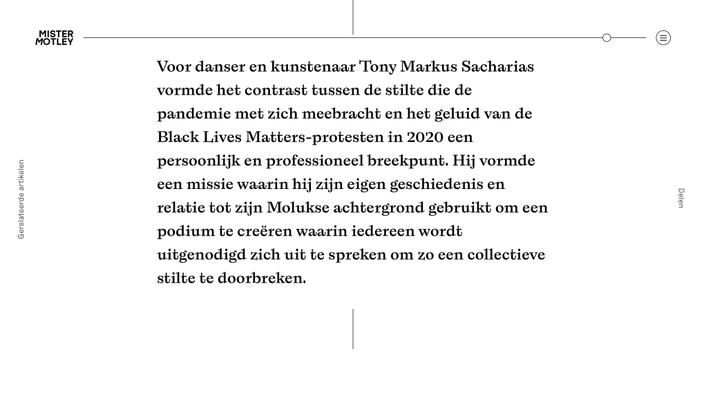 For dancer and artist Tony Markus Sacharias, the contrast between the silence brought about by the pandemic and the sound of the Black Lives Matters protests in 2020 was a personal and professional breaking point. He formed a mission in which he uses his own history and relation to his Moluccan background to create a stage in which everyone is invited to speak out in order to break a collective silence.